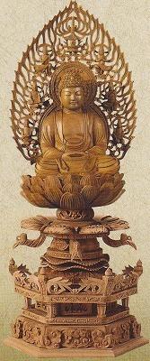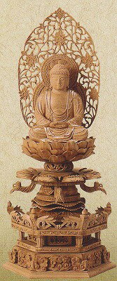 【仏像】白檀 六角台座ケマン付 座釈迦 飛天光背 【金泥書】 3.0寸