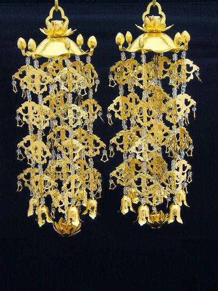 仏壇荘厳具の高級瓔珞(ヨーラク)真鍮 透し花珱珞(天然石水晶)消メッキ(1対)瑠璃入 小価格: 60,400円レビュー評価: 0.0 レビュー数:0 サイズ 総丈13cm×笠幅4cm 特徴 お仏壇の天井から一対吊るすのが隅珱珞(すみようらく)です。本来は宝石や石などを紐でつないだアクセサリーで、笠の回りには蓮のつぼみがあります。真鍮製にメッキ加工をしているので、サビてきたり金が剥がれてきたりしませんので安心して長くお使いいただけます。花びらをかたどった透かしの笠の匠のデザイン。消しメッキ加工で派手すぎず、落ち着いた金色で上品です。おまいりする時に、一番良く見える最下部の部分には翡翠(ヒスイ)の天然石を使用。透明の石は水晶を贅沢に使用しています。家具調仏壇や上置き仏壇、唐木仏壇にオススメです。 中サイズや 大サイズや 特大サイズのサイズもござ |